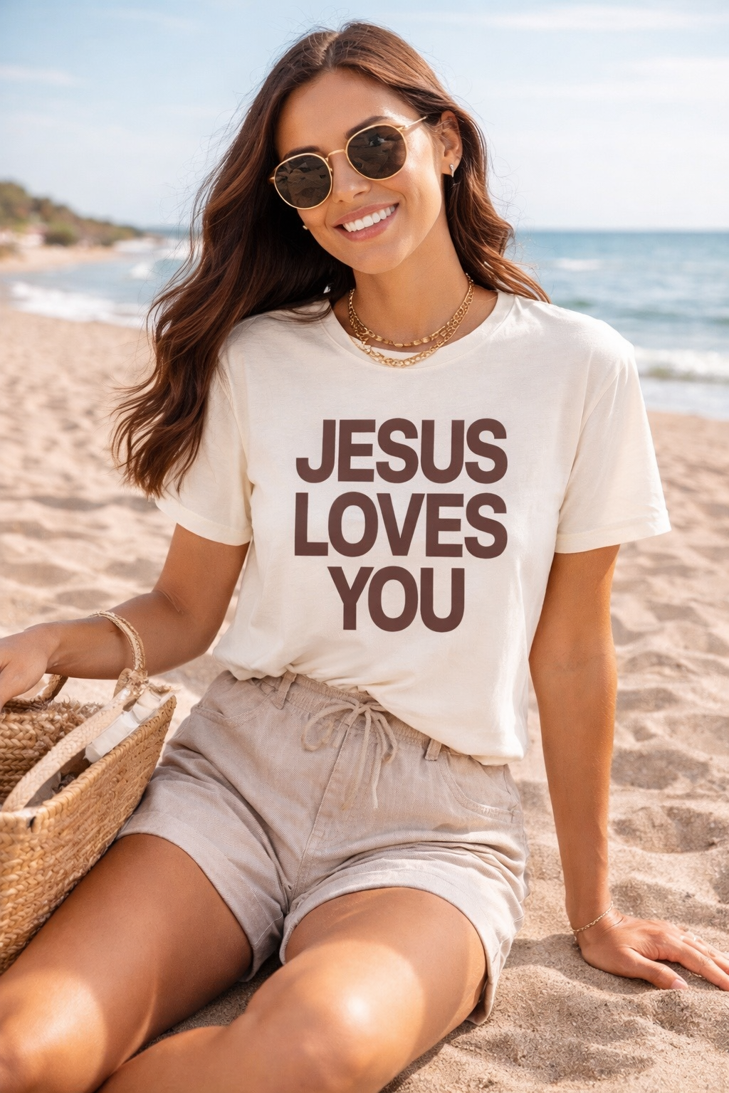 Our JESUS LOVES YOU tee carries the most life-changing truth in history, printed in a deep chocolate design that feels modern, elevated, and effortlessly wearable.